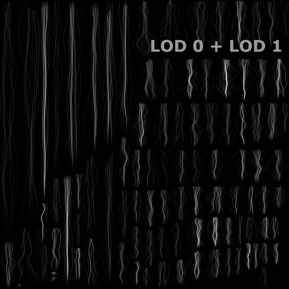 内容浏览器中生成的资产LODs在某些情况下,需要多个卡片资源,以便创建不同的 LOD。使用头发卡片生成器有三种不同的方法来实现这一点:独立资产。 如果允许每个 LOD 拥有自己的资产(网格和纹理图集),则可以在Groom编辑器的卡片选项卡中创建新的卡片资产,为其设置所需的 LOD 索引,然后使用此 LOD 所需的选项运行头发卡片生成器。从上一个 LOD 中减少卡片。如果已经生成了卡片资产,则可以在新的 LOD 中重新使用现有的纹理图集。为此,请激活 从上一个 LOD 中减少卡片选项。执行此操作后,唯一可用的选项将是三角形的数量和飞离的卡片。这将创建一个新资产,其卡片数量与之前的 LOD 相同,但每张卡片可以有更少的细分,并且可以丢弃飞离的卡片。在以下示例中,LOD 1 是使用与 LOD 0(之前创建)相同的卡片创建的,但目标是总三角形数为 20k 而不是 35k,并消除了飞散部分。纹理看起来非常相似,因为每张卡都使用相同的纹理。
