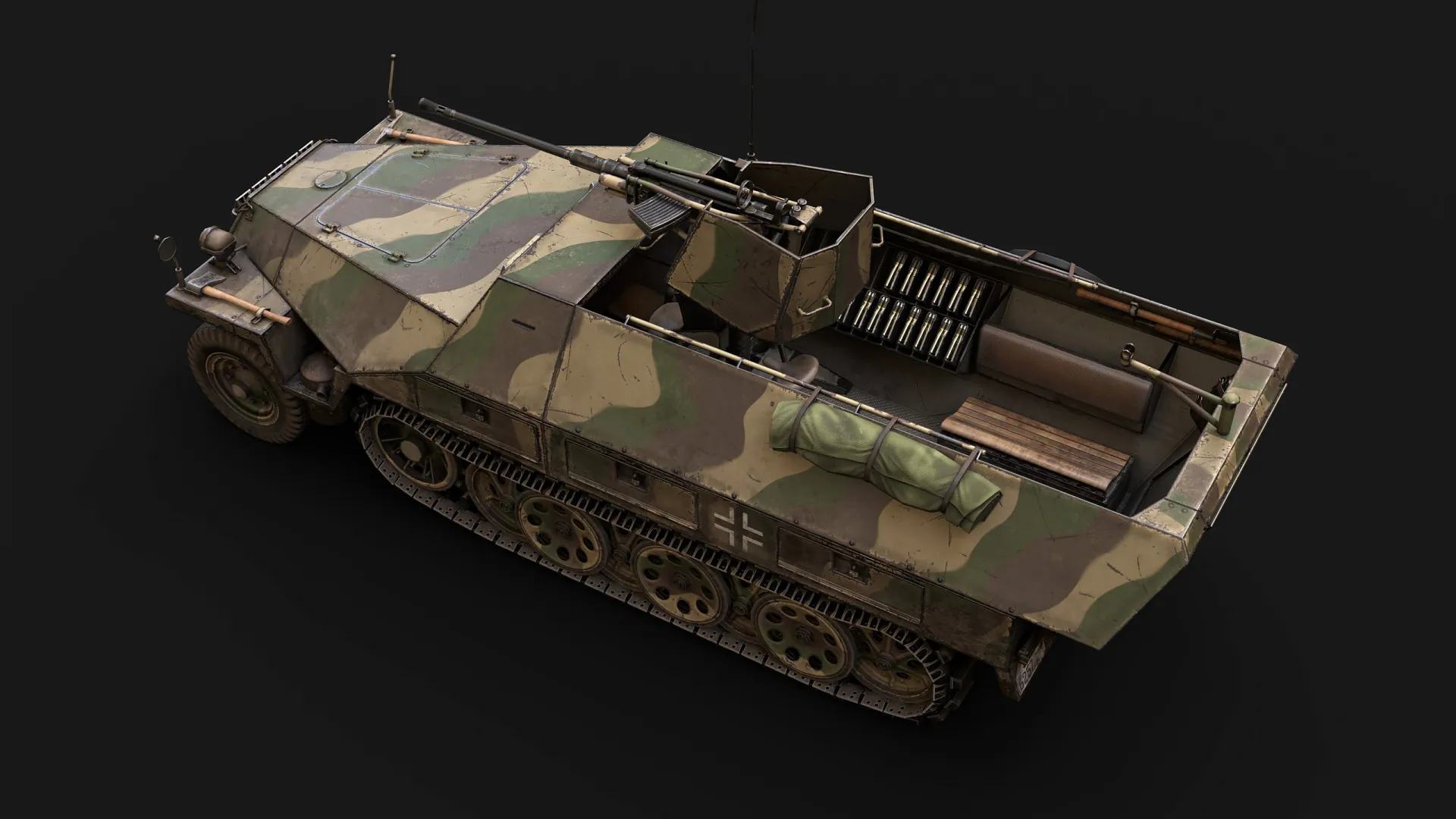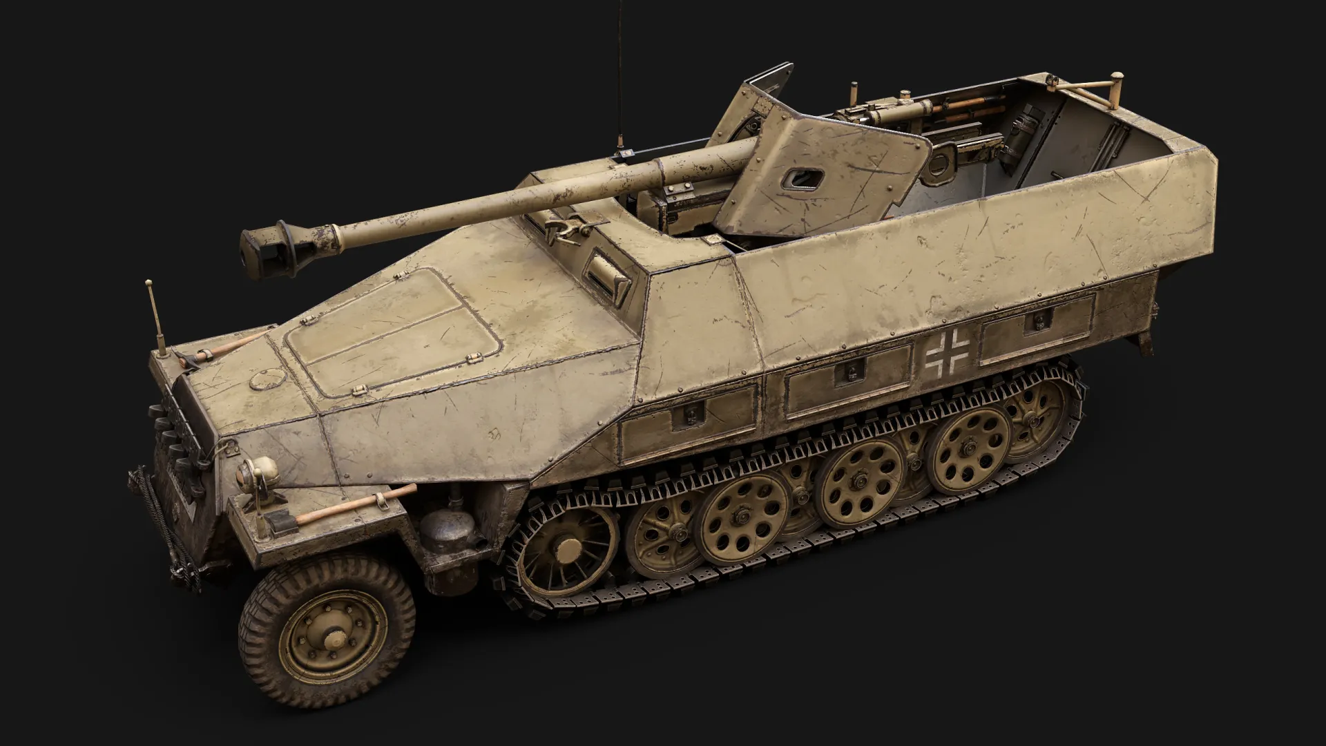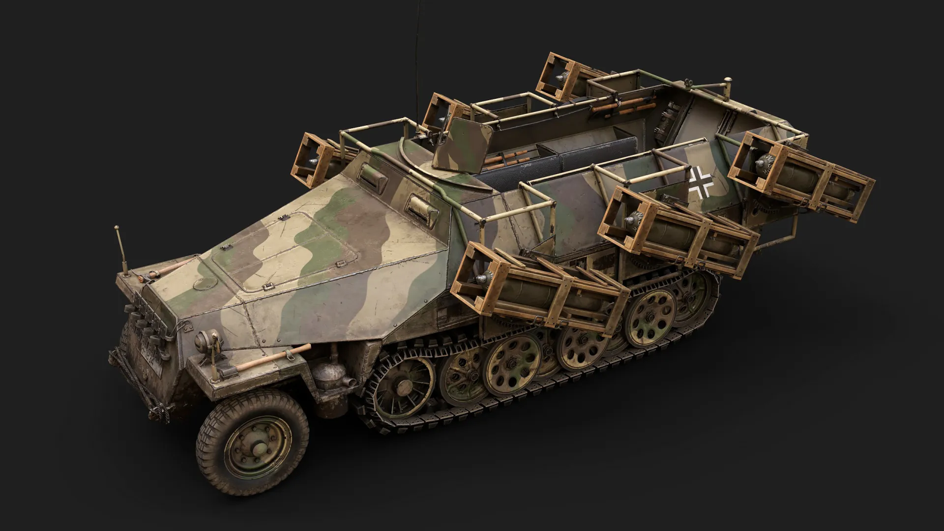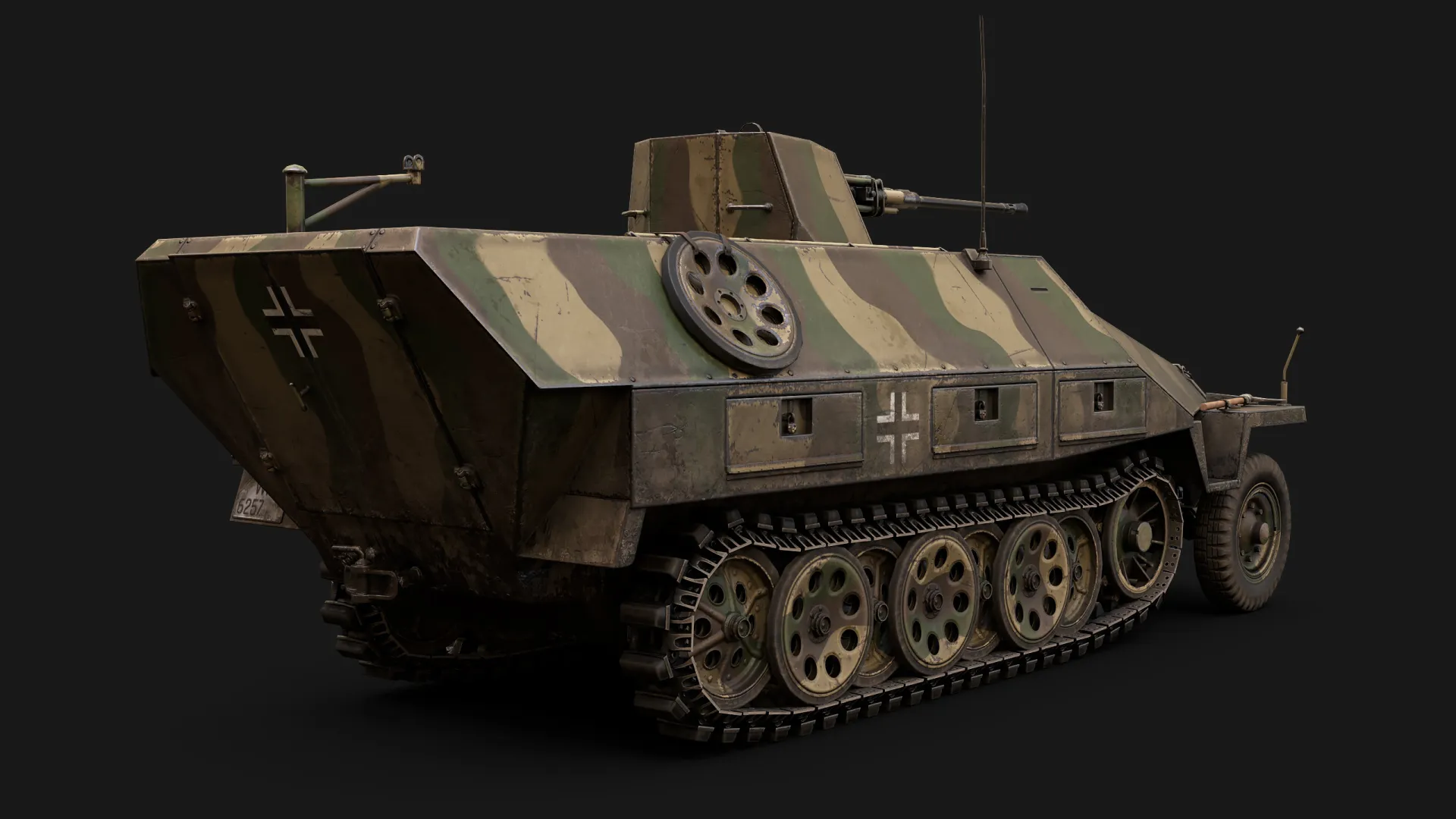 Artem Huleha modeled and asset, while Anton Huleha provided materials and lighting presets, there was also some consultation regarding texturing. This asset was created for the 'Call to arms: Gates of Hell - Ostfront' popular RTS game in realistic setting. The texture is 3072px*3072px for GEM-2 engine and 4k for renders. Tracks and wheels are baked from highpoly.