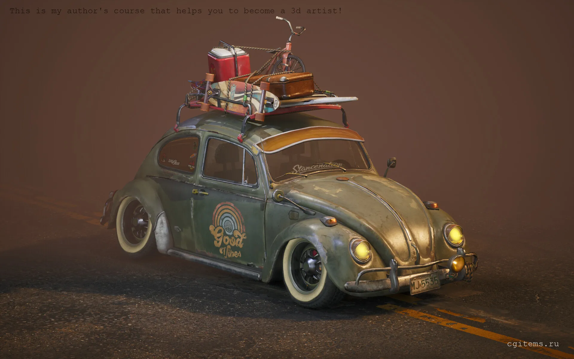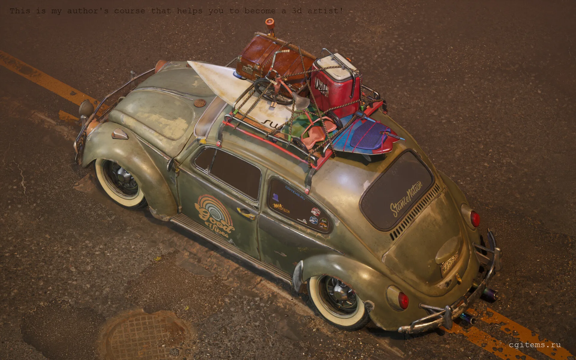 I did this project as a training course on creating a game model. The 1967 Volkswagen Käfer was taken as a basis. To get a beautiful composition, I added a few simple props that I placed on the trunk of the beetle.
