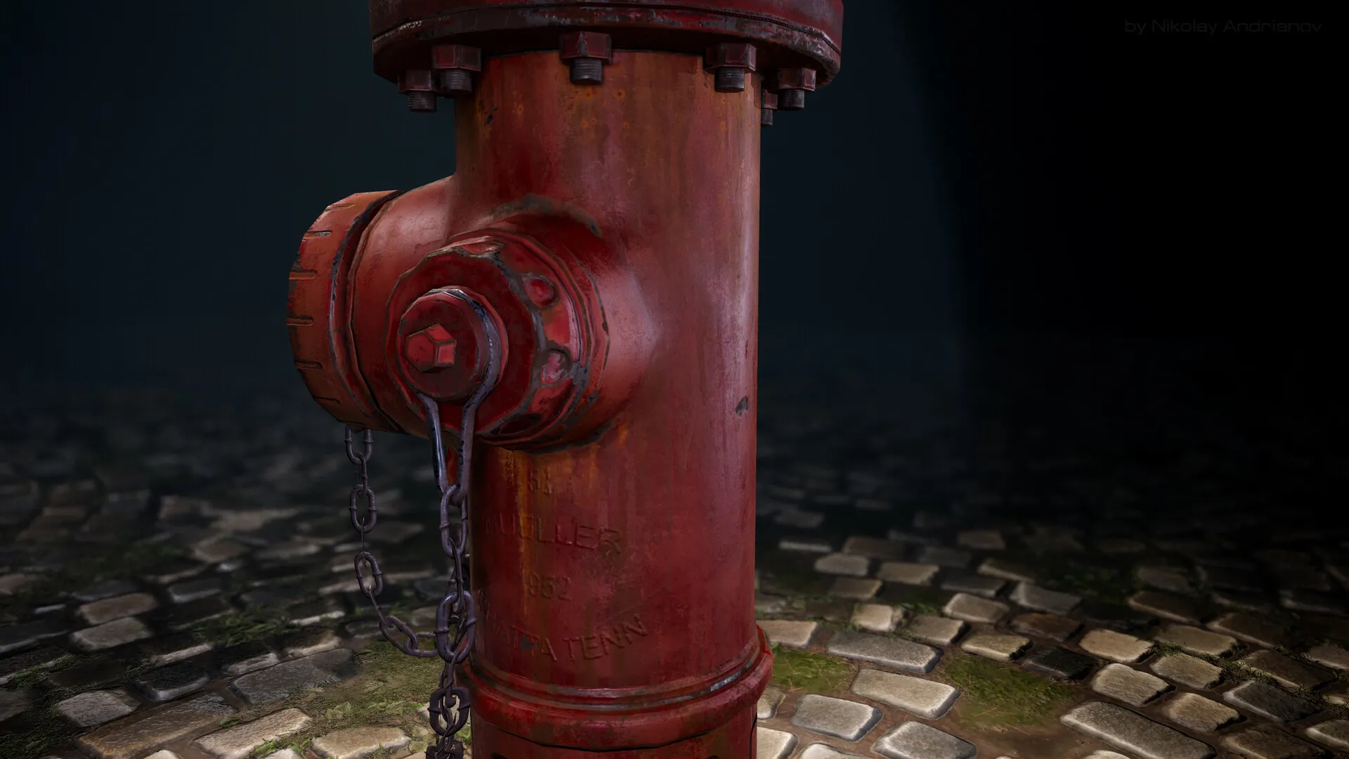 Hi, everybody. I demonstrate another work "The Fire Hydrant." In it, I used alpha blending, which allowed me to reduce a significant number of polygons in the metal chain.