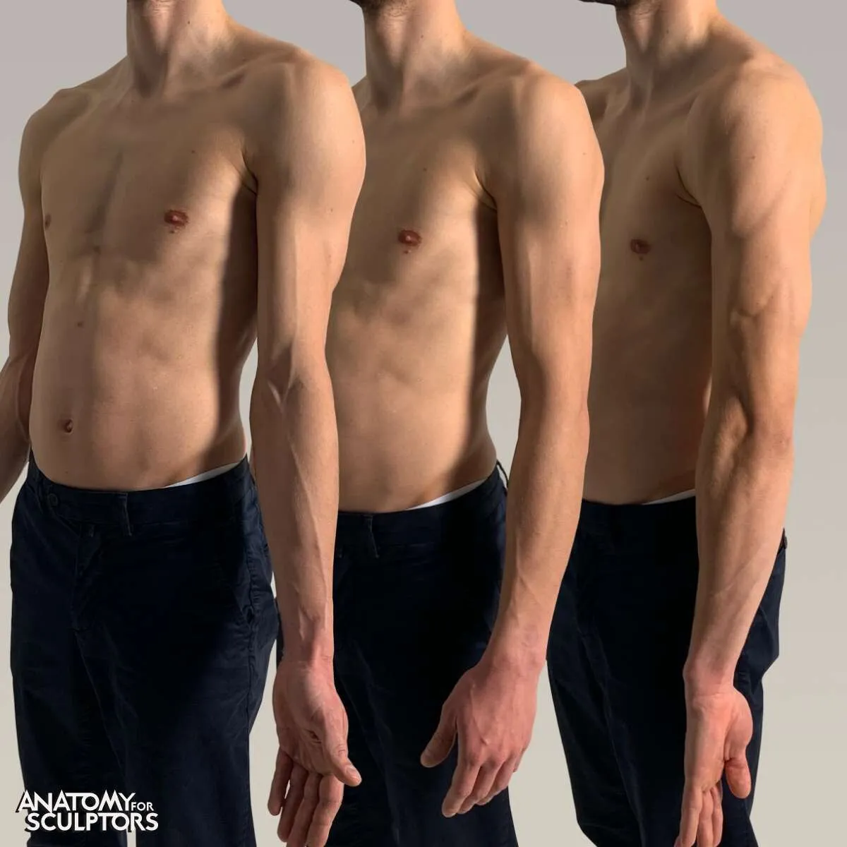这些图片展示了手臂的背屈、半内收和强迫内收。在后者中,肘关节向外旋转,表明肩部的运动,肩部的三角肌得到锻炼。用点标记的是三角肌粗隆、鹰嘴和尺骨远端头——这些骨骼标志帮助你跟踪肌肉附着点,当手臂内收时。