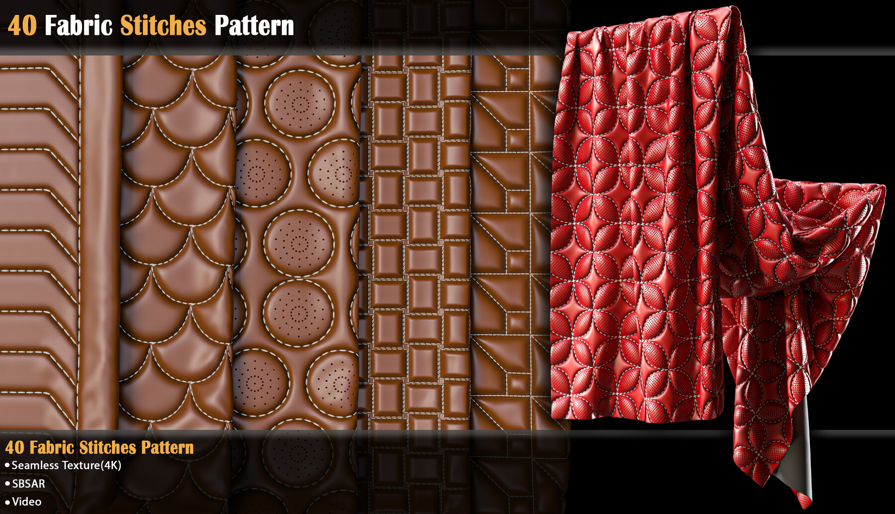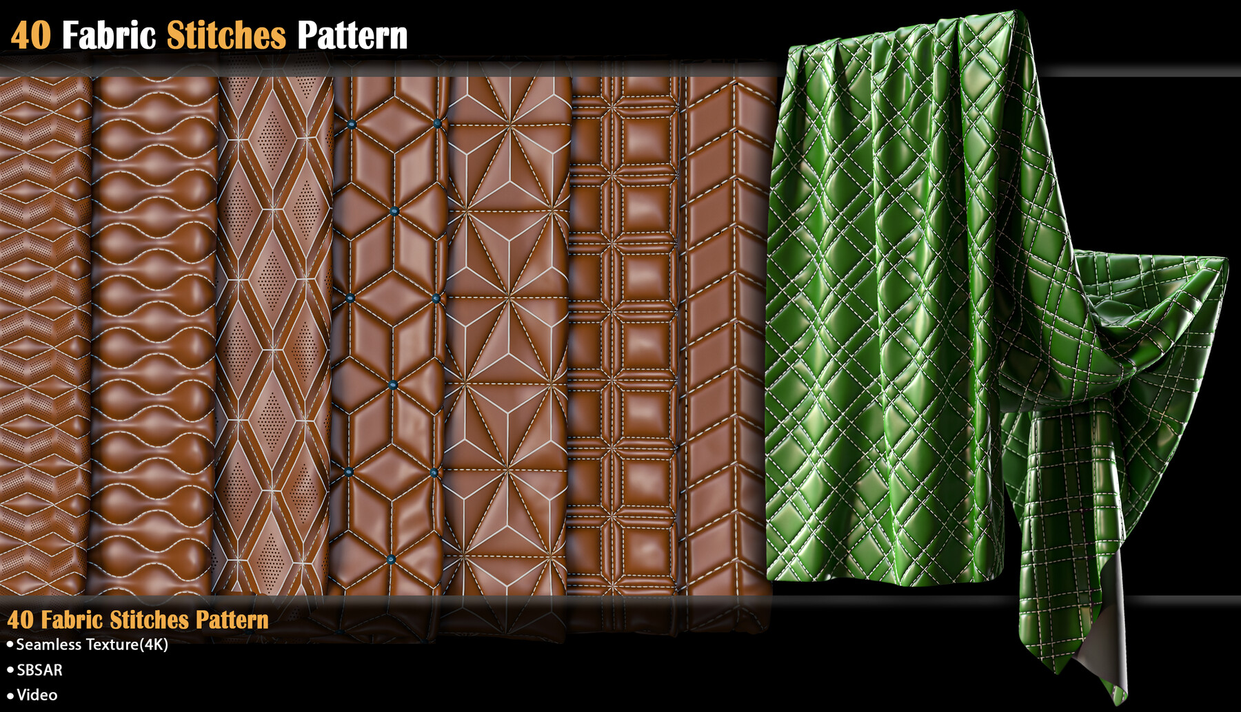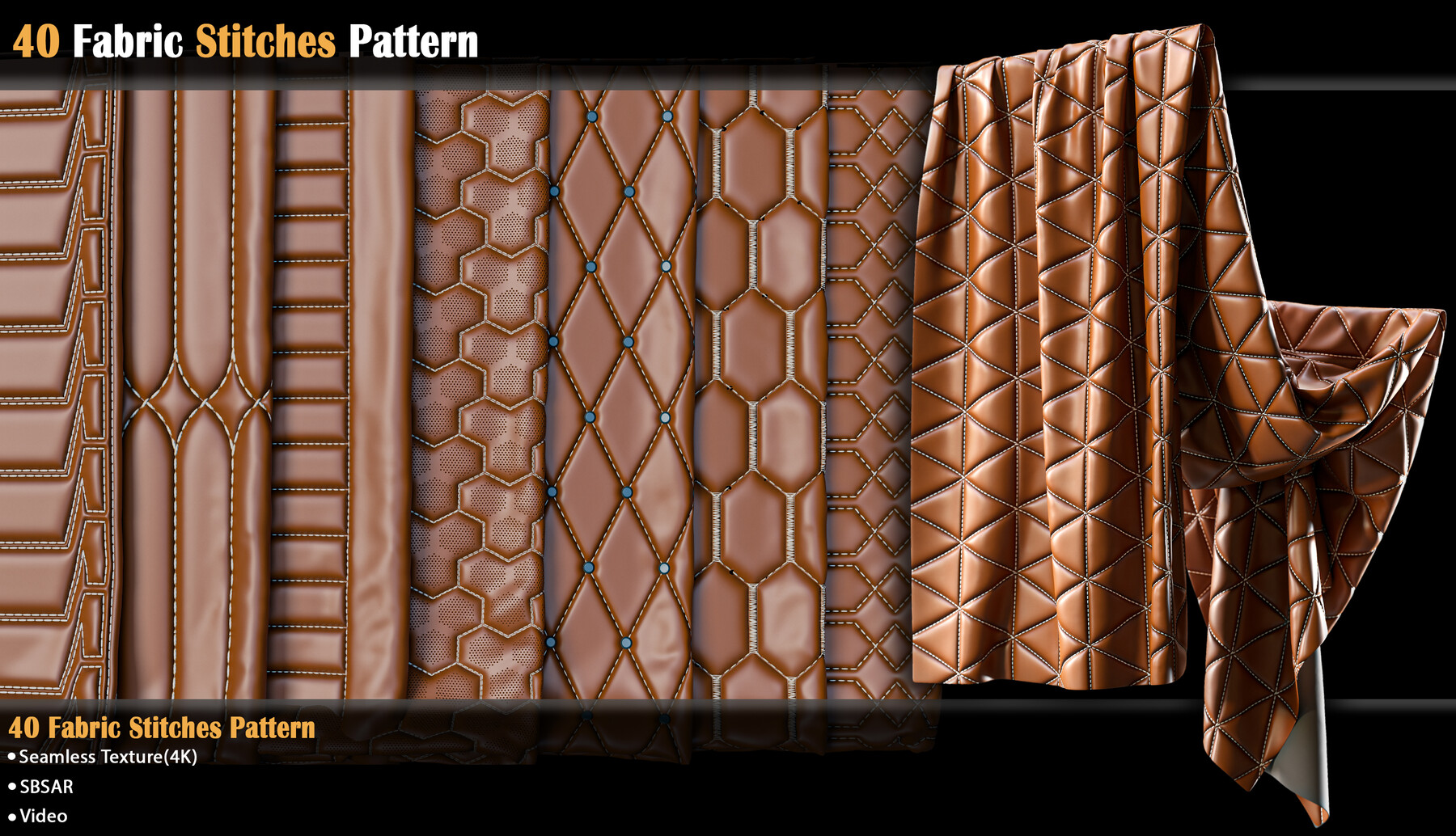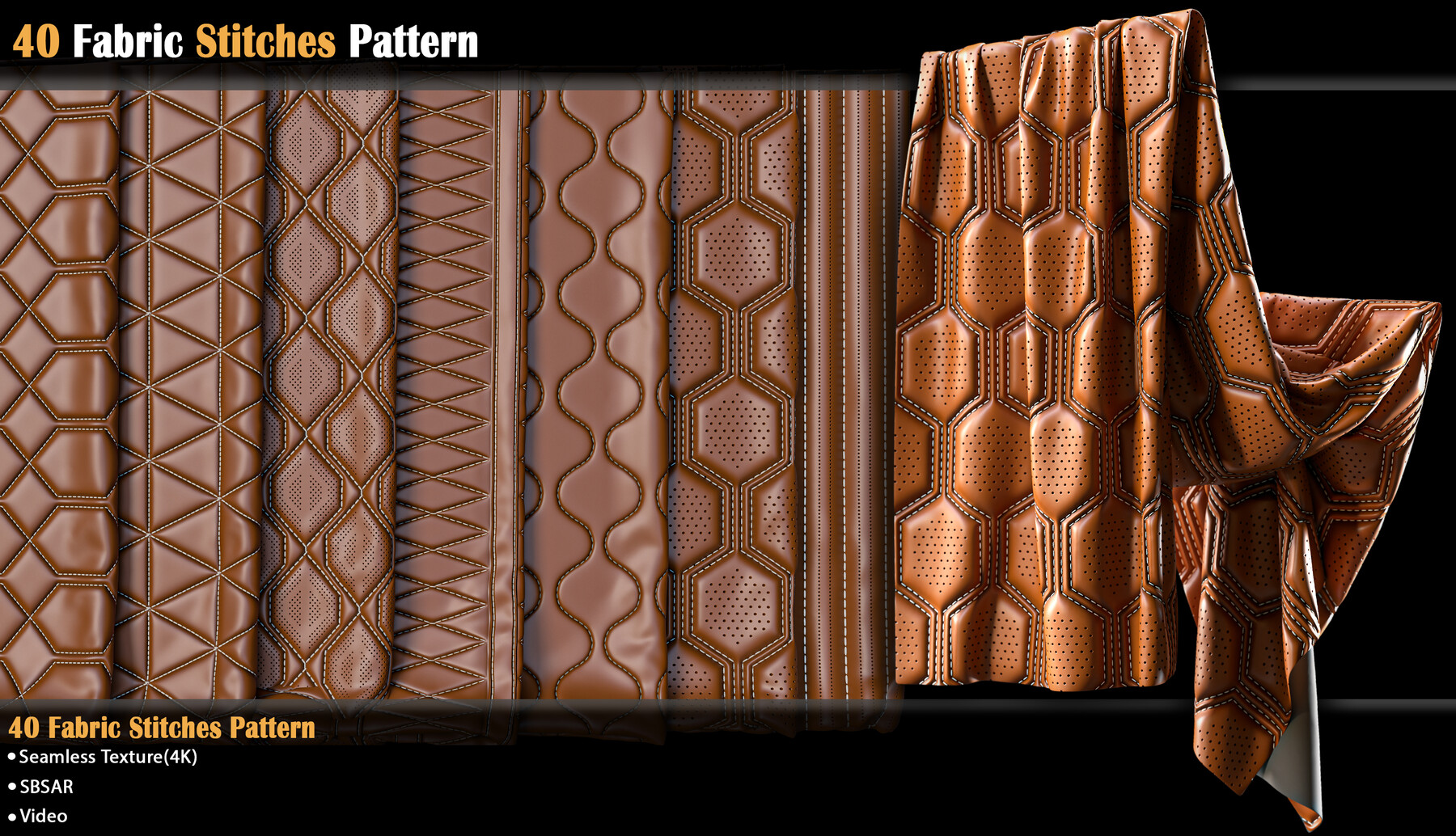 包含40组皮革缝线图案材质预设,可以应用于包袋、椅子、汽车座椅、床铺以及一些服装项目中,sbsar格式+PNG格式贴图,可以更改图案颜色、针脚颜色以及图案蓬松度